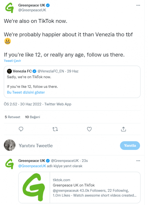 Birçok kullanıcıyı tebessüm ettiren bu paylaşıma cevap olarak Greenpeace’den de esprili bir tweet geldi: