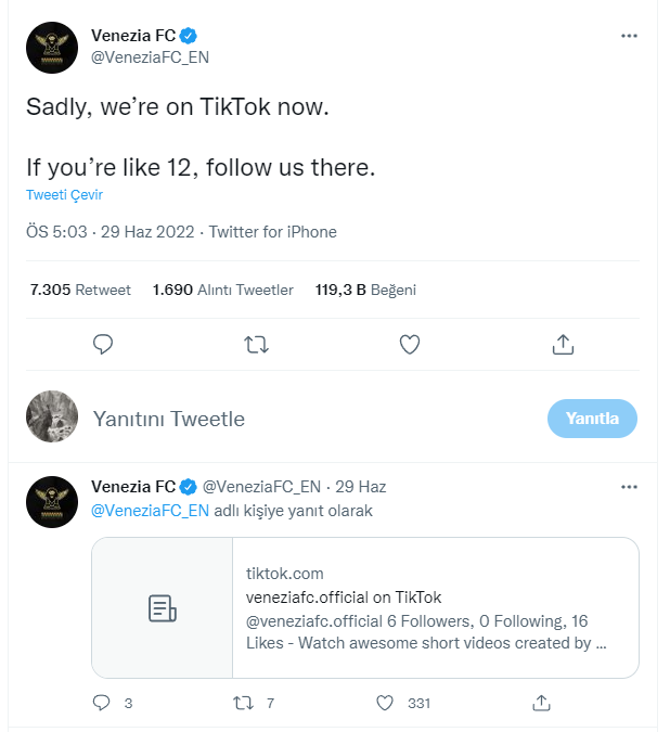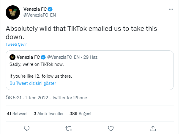 İtalya Serie A ekiplerinden Venezia, “Maalesef biz de TikTok’tayız. Eğer 12 yaşları civarındaysanız bizi oradan takip edebilirsiniz.” şeklinde bir paylaşımda bulundu.