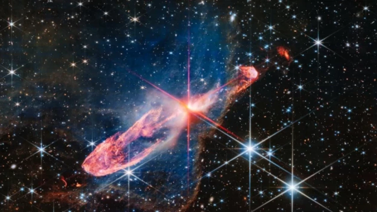 Webb teleskobunun kızılötesi kameraları ile çekilen görüntülerde, 1470 ışık yılı uzaktaki yıldız çifti, yıldız oluşumunu besleyen gaz ve toz bulutunun derinliklerinde, kırmızı ve pembe sivri uçların kesiştiği noktada, turuncu-beyaz bir merkez olarak görülüyor.
