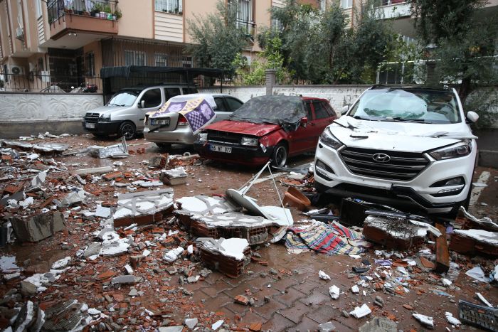 Çatıyla birlikte evin duvar parçaları ve klima motorunun da otoparktaki araçların üzerine düşmesi sonucu 4 otomobilde hasar oluştu.
