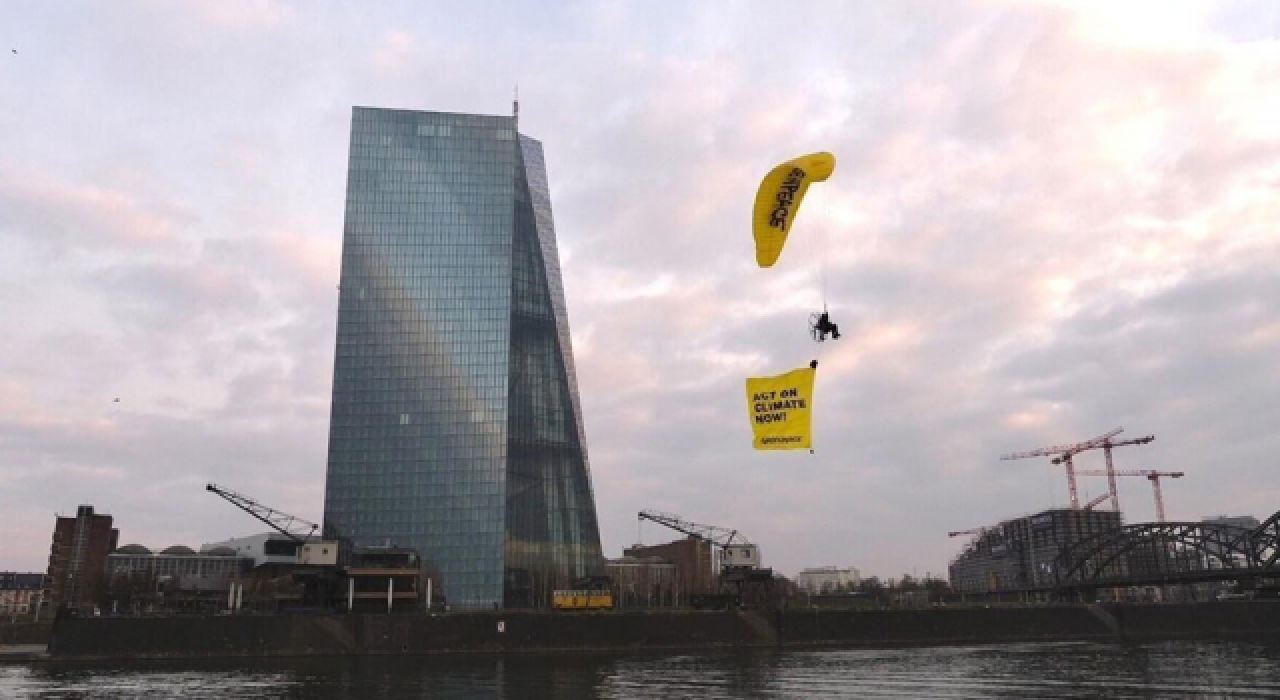 Çevre grubu Greenpeace aktivistleri, fosil yakıt protestoları kapsamında Almanya’nın Frankfurt kentinde bulunan Avrupa Merkez Bankası'nın (ECB) çatısına paraşütle indi.