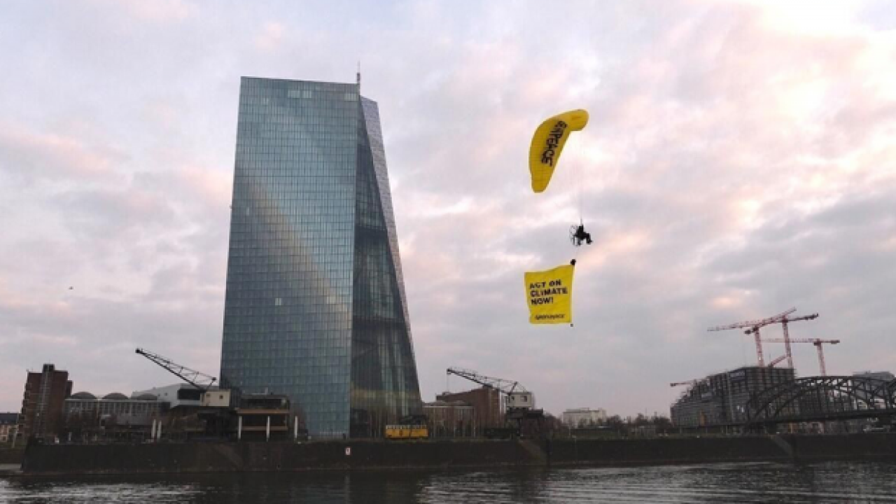 Greenpeace aktivistleri fosil yakıt protestoları kapsamında Avrupa Merkez Bankası’nın çatısına paraşütle inerek, fosil yakıt karşıtı pankart açtı.
