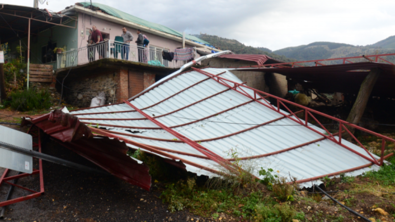 Şirindere Mahallesi’nde kuvvetli rüzgar ve sağanaktan 15 ev zarar gördü. Çok sayıda zeytin ağacı ile elektrik direği devrildi.