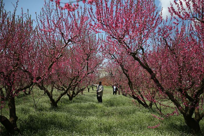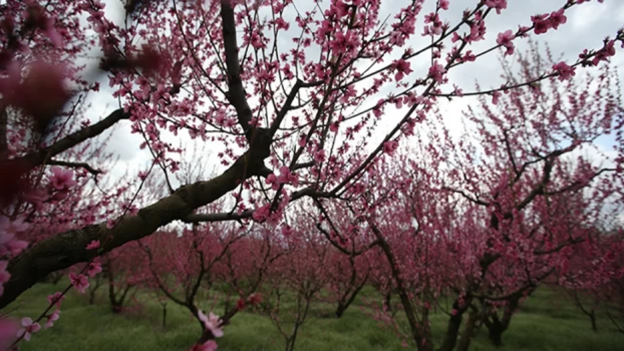 Kentin meşhur şeftalisinin üretildiği bahçelerde ise ağaçlardaki pembe çiçekler ve zeminin yeşilliğiyle ayrı bir güzellik oluştu.