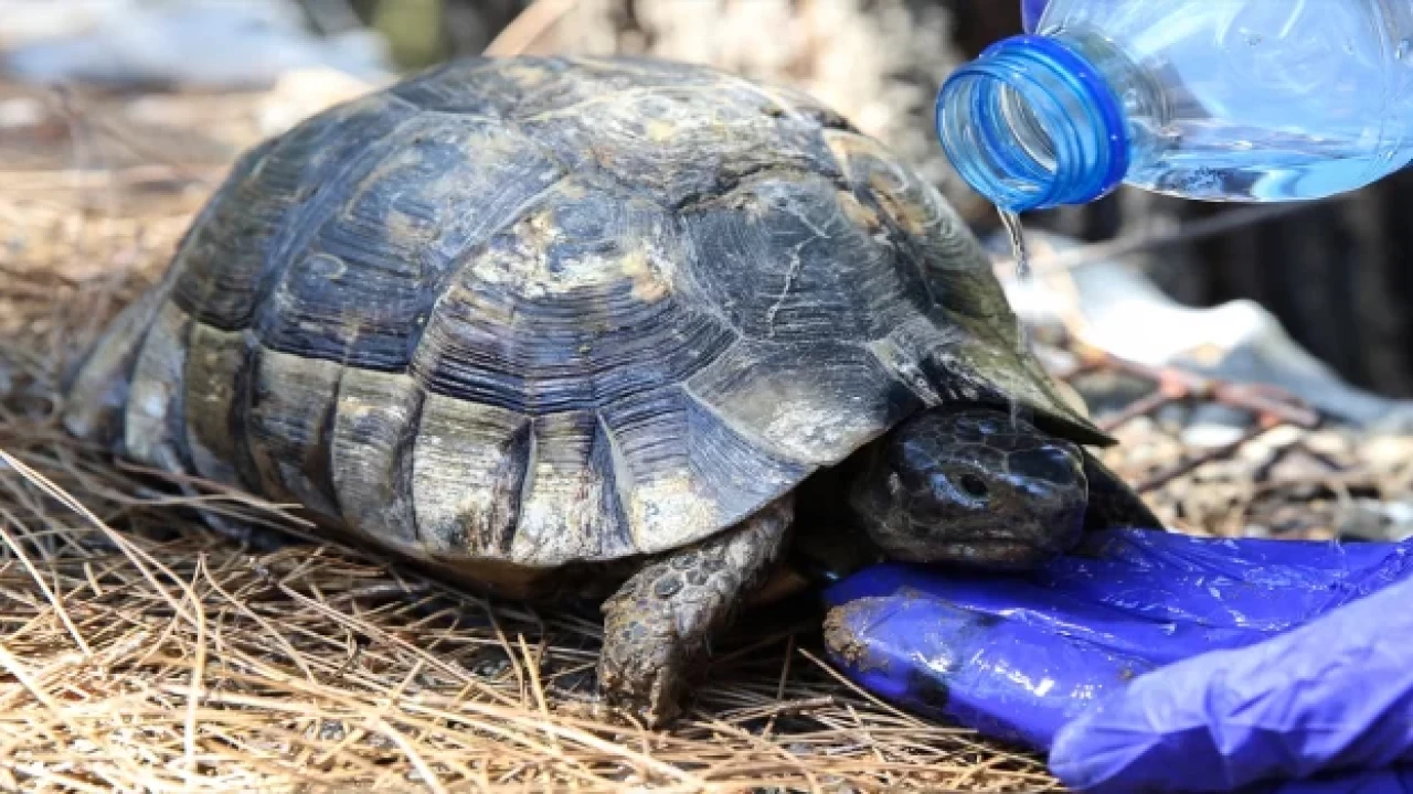 Hayvanlara su veren ekipler, yangından etkilenmeyen güvenli alana götürdükleri kaplumbağaları itfaiye ekiplerine teslim etti.