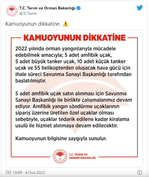 Tarım ve Orman Bakanlığı, 2022 yılında orman yangınlarıyla mücadele edebilmek amacıyla hava gücü için ihale süreci paylaşımı yaptı.