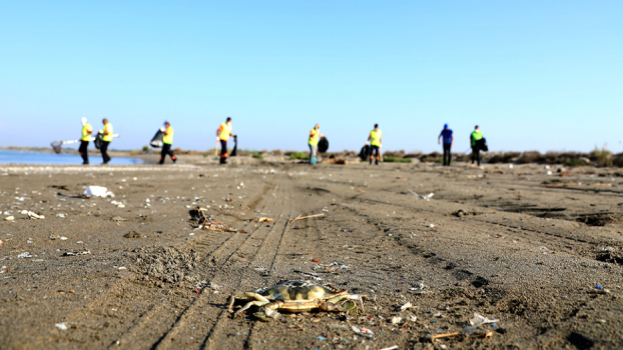 Mersin'in Tarsus ilçesi sahillerinde, Suriye kaynaklı petrol sızıntısının temizlenmesi için başlatılan çalışmalar titizlikle yürütülüyor.