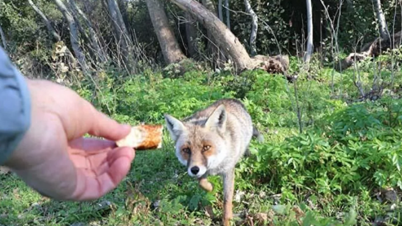 Figen Türker, aç olduğunu fark ettiği tilkiyi elleriyle simit vererek besledi. Eşi Mennan Türker de cep telefonu ile kaydettiği görüntüleri, sosyal medyada paylaştı.