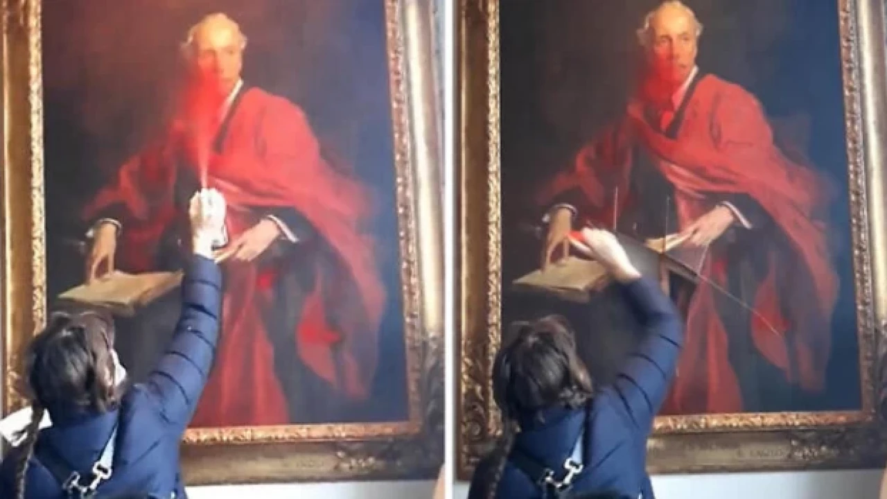 Cambridge Üniversitesi'ne bağlı Trinity College'ta sergilenen Lord Arthur James Balfour'un portresi tahrip edildi. Filistin yanlısı "Palestine Action" grubuna bağlı bir aktivist, önce tabloyu kırmızıya boyadı. Ardından maket bıçağıyla kesti.