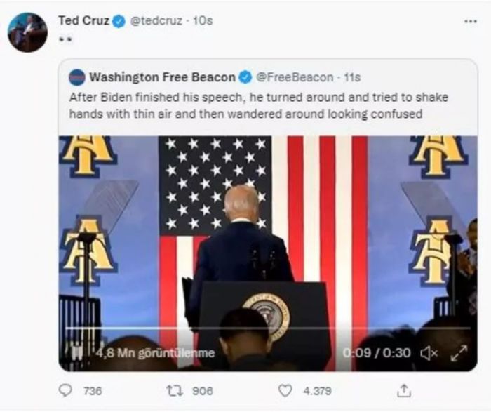 Biden'ın görüntülerinin yayılması sosyal medyada da geniş yankı uyandırırken, 51 yaşındaki Teksas Senatörü Cruz, Twitter hesabından bir çift göz emojisi koyarak paylaştı.