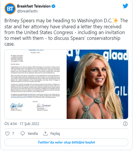 Kongre üyeleri, Spears'a yazdıkları mektupta, "Vesayet ve vasilik sürecinde yaygın olan birçok konu gün ışığına çıkarıldı. Özellikle rahatsız edici olan, yıllardır kişisel ve finansal çıkarlarınızı temsil etmesi için kendi avukatınızı tutamadığınız haberiydi. İlk dilekçeyi çevreleyen diğer konular, vasiliğin kalıcılığı ve isteğiniz dışında bir işte çalışmaya zorlanmak, hepsi eşit derecede endişe verici. Bu amaçla, sizi ve avukatınızı, adalete nasıl ulaştığınızı kendi sözlerinizle anlatmak için karşılıklı olarak uygun bir zamanda Kongre'de bizimle görüşmeye kişisel olarak davet etmek istedik. Hikâyenizin, sizden ve sanatınızdan halihazırda ilham alan milyonların dışında sayısız kişiye güç vereceğine şüphe yok. Lütfen bilin ki, kendiniz için savaşmaktan başka bir şey yapmak zorunda değilsiniz, ancak isterseniz, vasilik sisteminde karşı karşıya kaldığınız duygusal ve finansal kargaşa hakkında daha fazla bilgi edinmekten memnuniyet duyarız" ifadelerini kullandı.