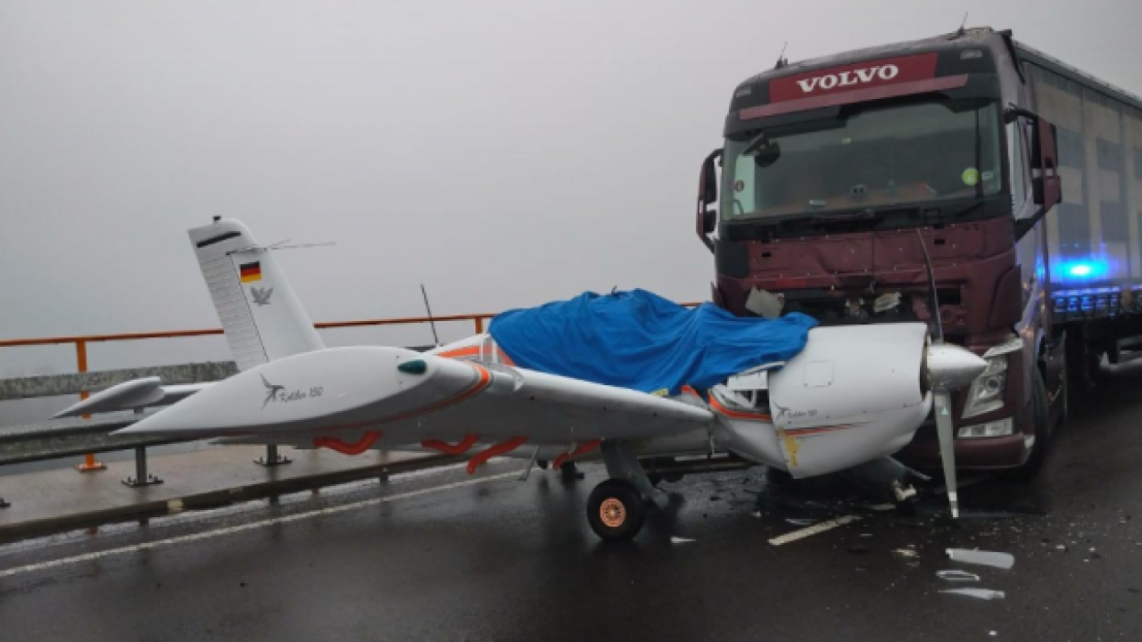 Ancak uçak, otobandan geçen bir kamyonla çarpıştı. Polis, yaklaşık 60 bin euroluk hasar olduğunu açıkladı.