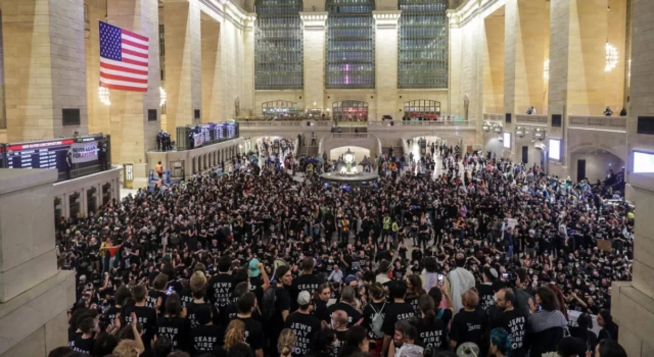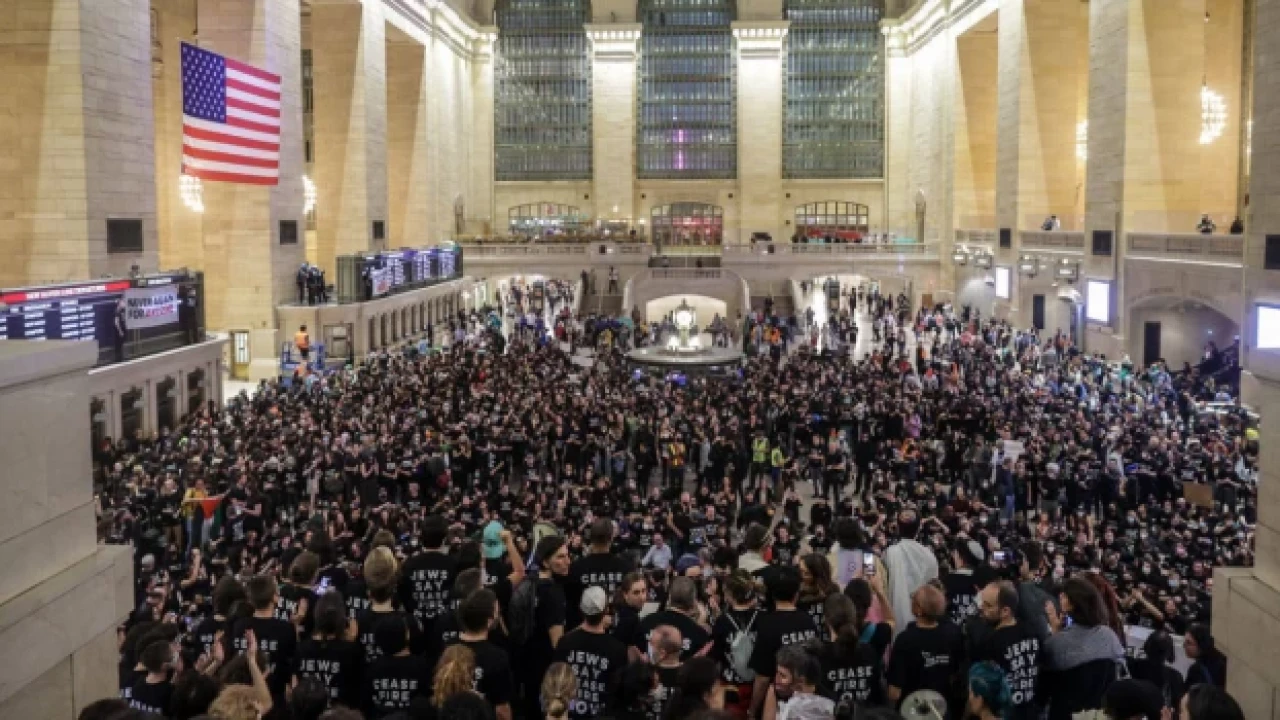 "Barış için Yahudi Sesi" (JVP) adlı organizasyonun, sosyal medya platformundan yaptığı duyuru ile toplanan gruplar, New York'un en büyük tren istasyonu Grand Central'in ana yolcu salonunu işgal etti.