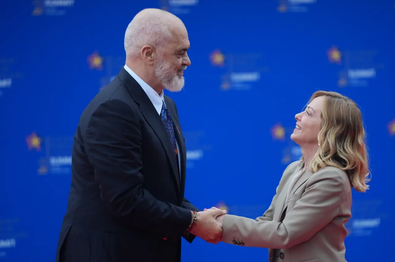 Dikkatleri üzerine Rama kırmızı halıda liderleri karşılarken Meloni'nin önünde diz çökmesi ise gündem olan bir diğer ayrıntıydı.
