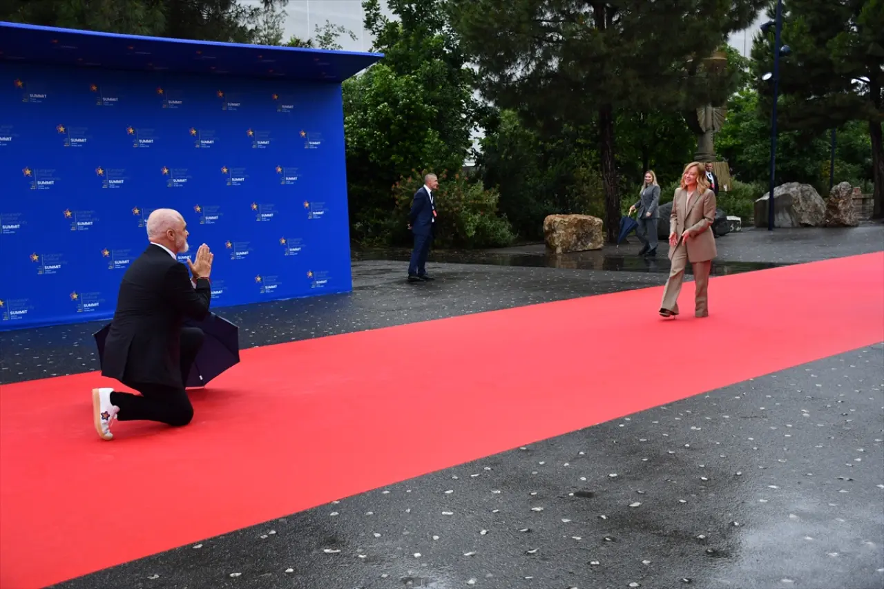Arnavutluk Başbakanı Edi Rama'nın, İtalya Başbakanı Giorgia Meloni'yi kırmızı halıda diz çökerek karşılaması ise gülüşmelere neden oldu.