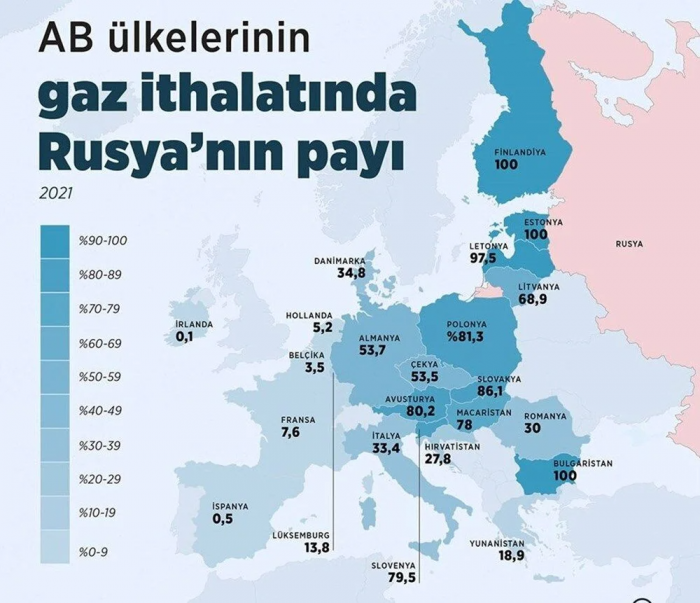 AB ülkeleri içinde Rusya'dan en fazla ithalatı 19 milyar euroyla Almanya, 11,1 milyar euroyla Hollanda, 8,6 milyar euroyla İtalya, 7,4 milyar euroyla Polonya, 5,5 milyar euroyla Fransa ve 5,2 milyar euroyla Bulgaristan yaptı. Belçika bu dönemde Rusya'dan 4,5 milyar euro ve İspanya 3,3 milyar euroluk fosil yakıt ithalatı yaptı.