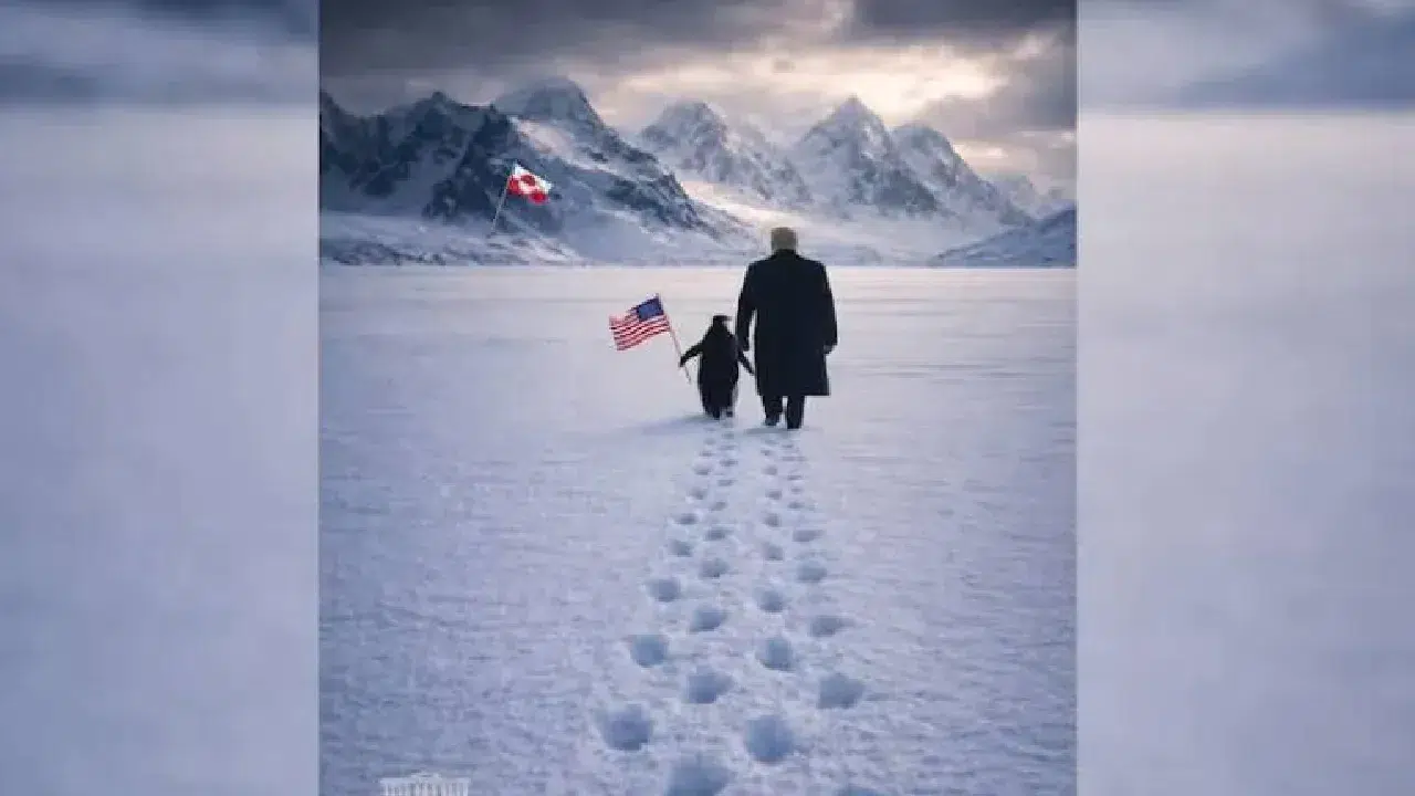 ABD, bu kez resmi açıklamalar yerine viral bir görselle Grönland’a yönelik mesajını iletmiş oldu. Görselde, penguen ABD bayrağı taşırken, dağlarda Grönland bayrağı da görülüyor ve üst mesajda “Pengueni kucakla” ifadeleri yer alıyordu.