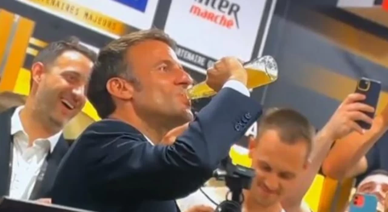 Macron, hafta sonu Paris'teki Stade de France'da izlediği ragbi liginin final maçında Toulouse ekibinin zaferiyle sevindi. Maçın ardından Macron, galip gelen takımı kutlamak için soyunma odasına gitti ve orada kendisine bir şişe bira ikram edildi. Macron'a "bir dikişte içmesi" istendi.