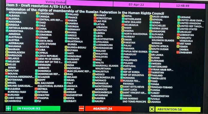 Rusya'nın İnsan Hakları Konseyi'nden çıkarılmasına 93 ülke destek verirken, 24 ülke karşı çıktı, 58 ülke ise çekimser kaldı.