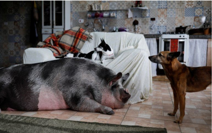 Lara, etrafında kedi ve köpeklerle birlikte uzandığı kanepesinde Lilica'yı gıdıklarken, "Onu küçük bir domuz olacağını düşünerek satın aldım, ama dev bir hayvana dönüştü" diyor.