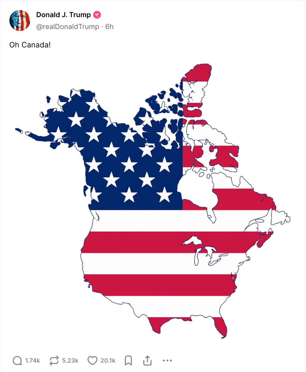 Donald Trump, Kanada'nın ABD'ye 51. eyalet olarak dahil edilmesini savundu ve bu fikrini Truth Social platformunda paylaştığı bir harita ile takipçileriyle paylaştı. Haritada, Kanada ve ABD tek bir ülke olarak birleştirilmişti.