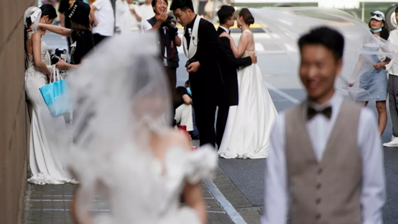 Geçen yıl salgın nedeniyle düğünlerin çoğunun ertelendiği Çin'de normalleşmenin başlamasıyla bir çok çift, İşçi Bayramı tatilini fırsat bildi.