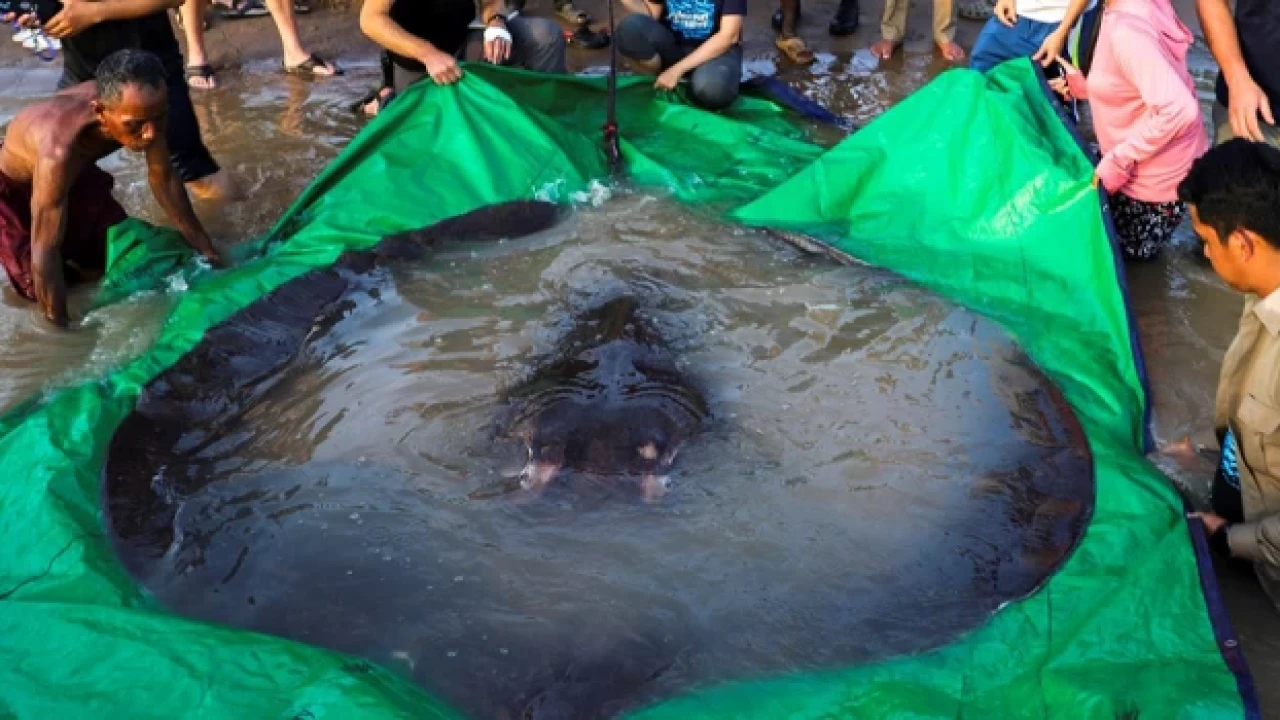 Kamboçya'da, 300 kilogram ağırlığında, "dünyanın en büyüğü" olduğu tahmin edilen tatlı su balığı ağlara takıldı.