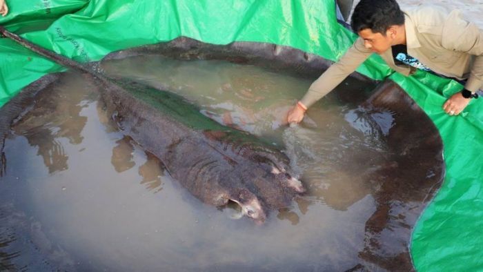 Nesli tükenmekte olan dev vatoz balığının hareketlerinin izlenmesi için takip cihazı takılarak nehre geri bırakıldığı bilgisi paylaşıldı.