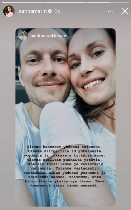 Boşanma kararı alan Marin ve Raikkonen paylaşımda, "Birlikte geçirdiğimiz 19 yıl ve sevgili kızımız için minnettarız. En iyi arkadaşlar olarak kalacağız." ifadelerine yer verdi.
