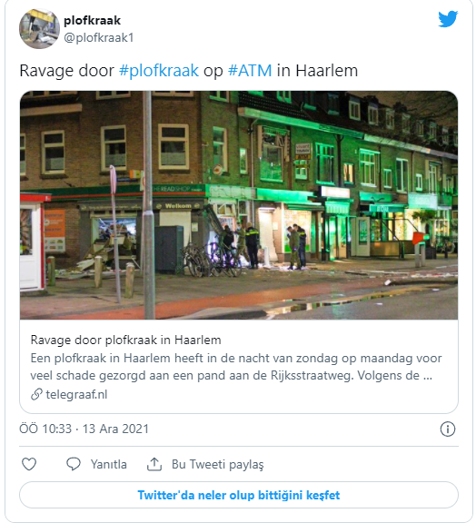 Hollanda polisinin Twitter'dan yaptığı açıklamada, Haarlem şehrindeki bir ATM'nin sabaha karşı hırsızlar tarafından patlatıldığı belirtildi. ATM'nin bulunduğu Rijksstraatweg Caddesi'ndeki ev ve iş yerlerinin camlarının kırıldığı ve binalarda hasar meydana geldiği kaydedildi.
