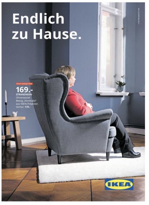 Merkel'e benzeyen birinin IKEA yapımı koltukta oturduğu görülen ilanda "Sonunda evindesin" ifadeleri yer alıyor.