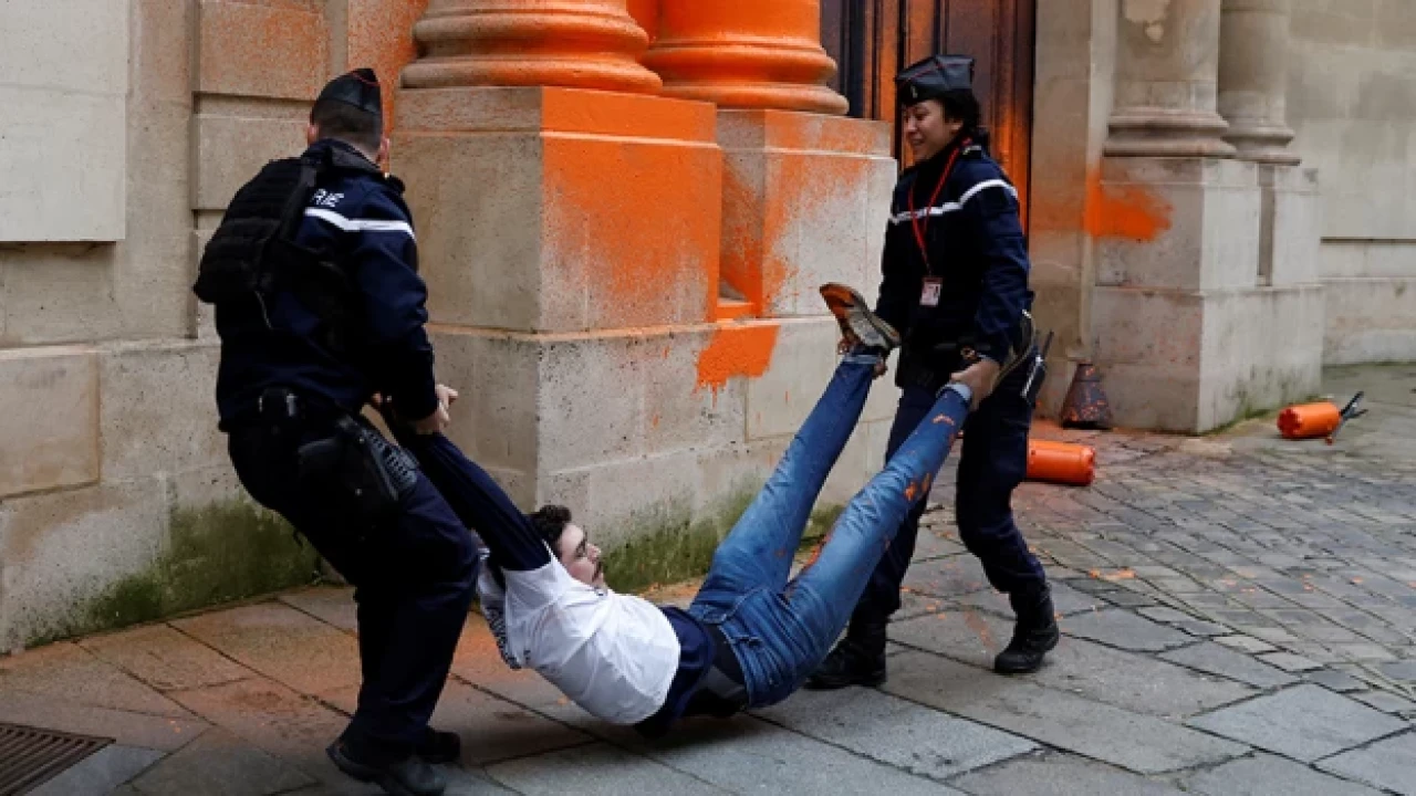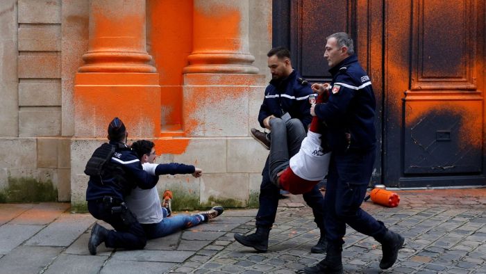 Twitter’da “FransızGastesi” hesabının paylaştığı videoda ise iklim aktivistlerinin Fransa Ekolojik Dönüşüm Bakanlığı binasını turuncuya boyadığı anlar görüldü.
