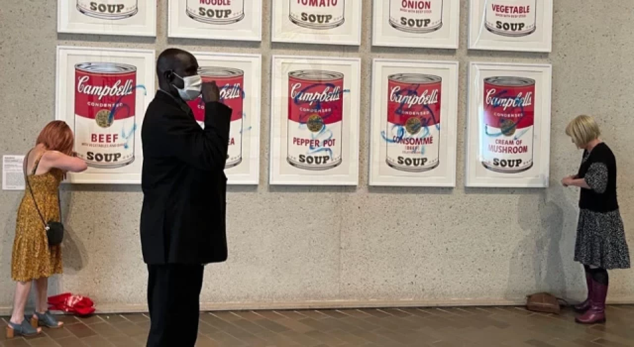 İklim konusundaki taleplerini dile getirmek için ünlü ressamların eserlerine saldırmaya devam eden “Stop Fossil Fuel Subsidies (Fosil Yakıt Sübvansiyonlarını Durdurun)” adlı çevreci grup, sanatçının “Campbell’s Soup Cans” adlı eserini mavi kalemle karaladı.