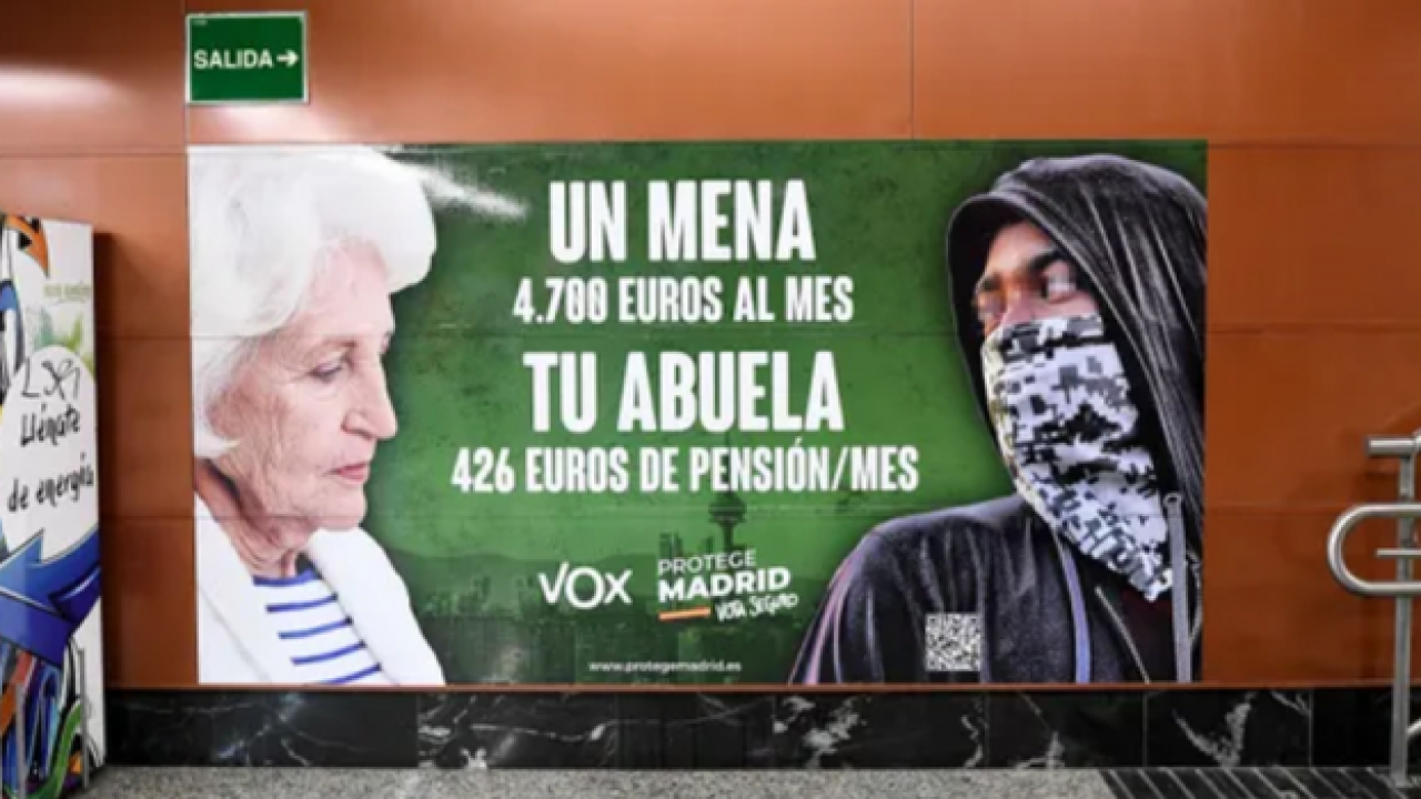 Posterde aynı zamanda İspanya'da 18 yaş altı mülteciler için aşağılama hedefiyle kullanılan "Menas" ifadesi kullanıldı: "Mena için 4 bin 700 Euro. Babaannenin emekli maaşı için 426 Euro. Madrid'i koru, güvenliğe oy ver" .