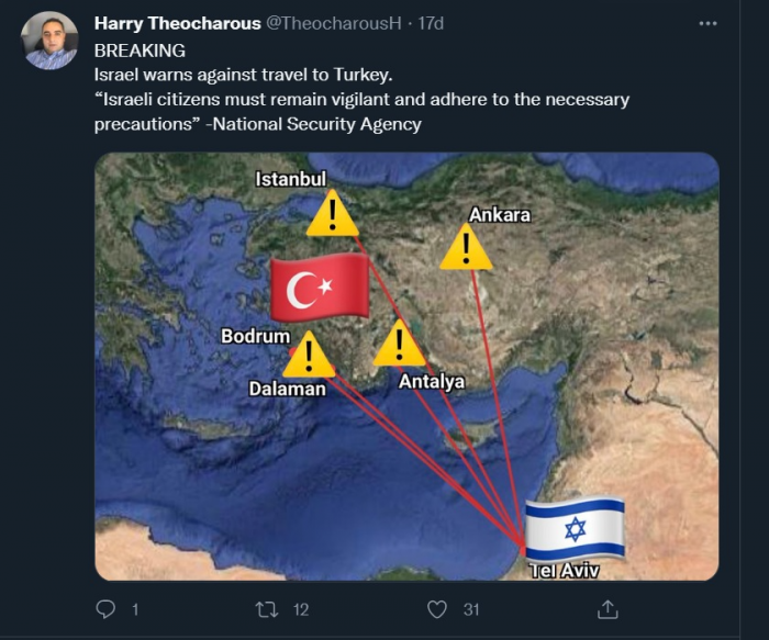 Yapılan açıklamada, “Türkiye şu anda İsrailliler için yüksek düzeyde riskli bir ülke” ifadeleri kullanıldı.