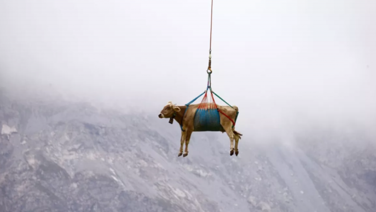 İsviçre Alpleri'nin yüksek çayırlarında bir grup inek yaralandı. Yaralanan inekleri bölgeden almak için helikopter devreye girdi. Helikopter, tahliye operasyonu için meraya indi.