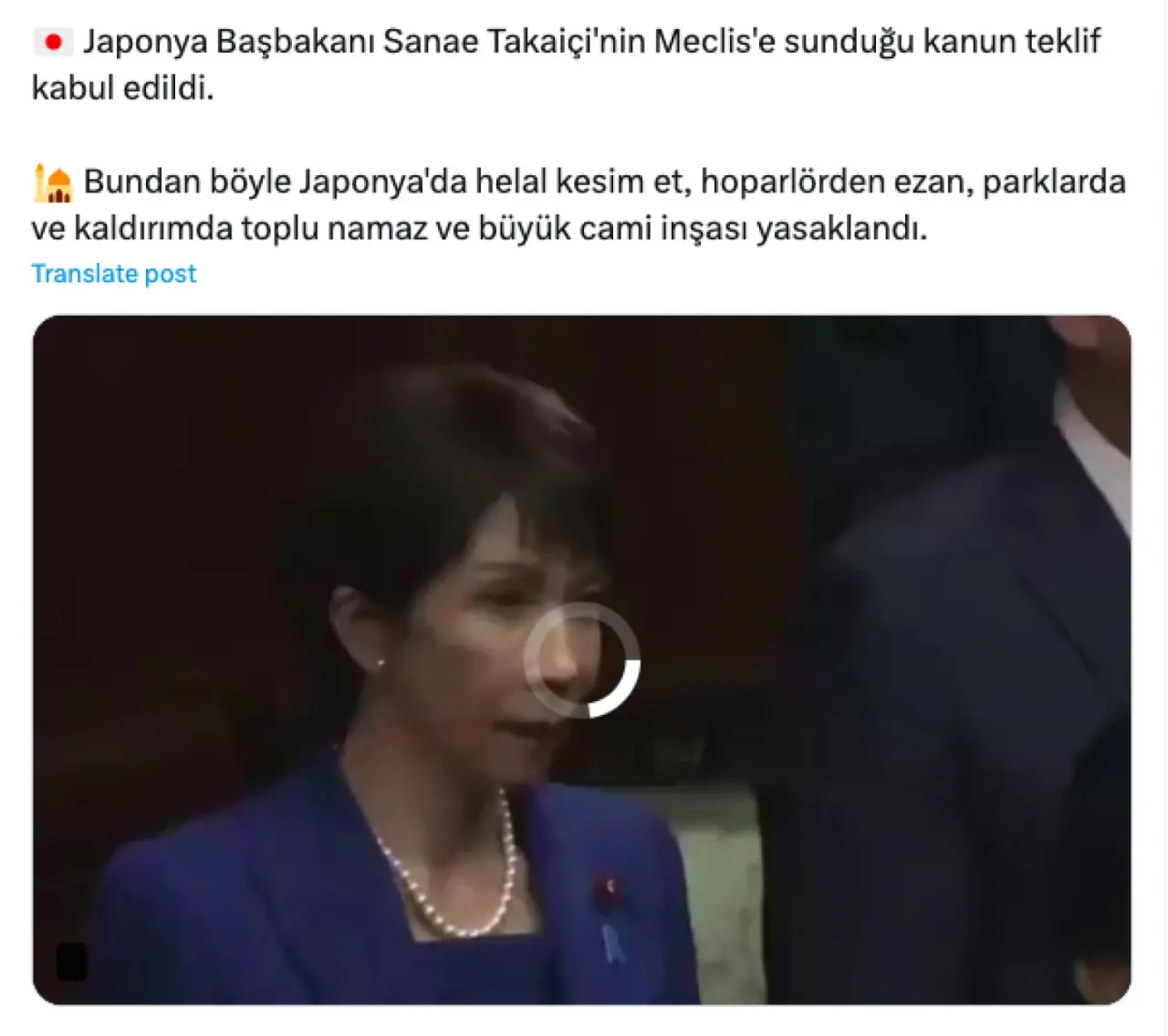 Sosyal medyada 16 Şubat 2026 tarihinde paylaşılan bir gönderide, Japonya’da helal kesim etin, hoparlörden ezan okunmasının, park ve kaldırımlarda toplu namaz kılınmasının ve büyük cami inşa edilmesinin yasaklandığı öne sürüldü. İddia, Japonya Parlamentosu’na ait olduğu belirtilen bir video ile desteklendi.