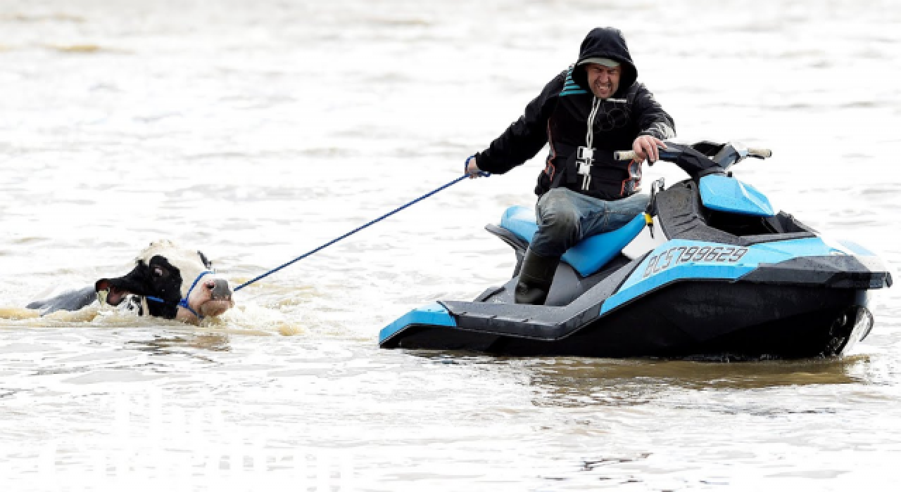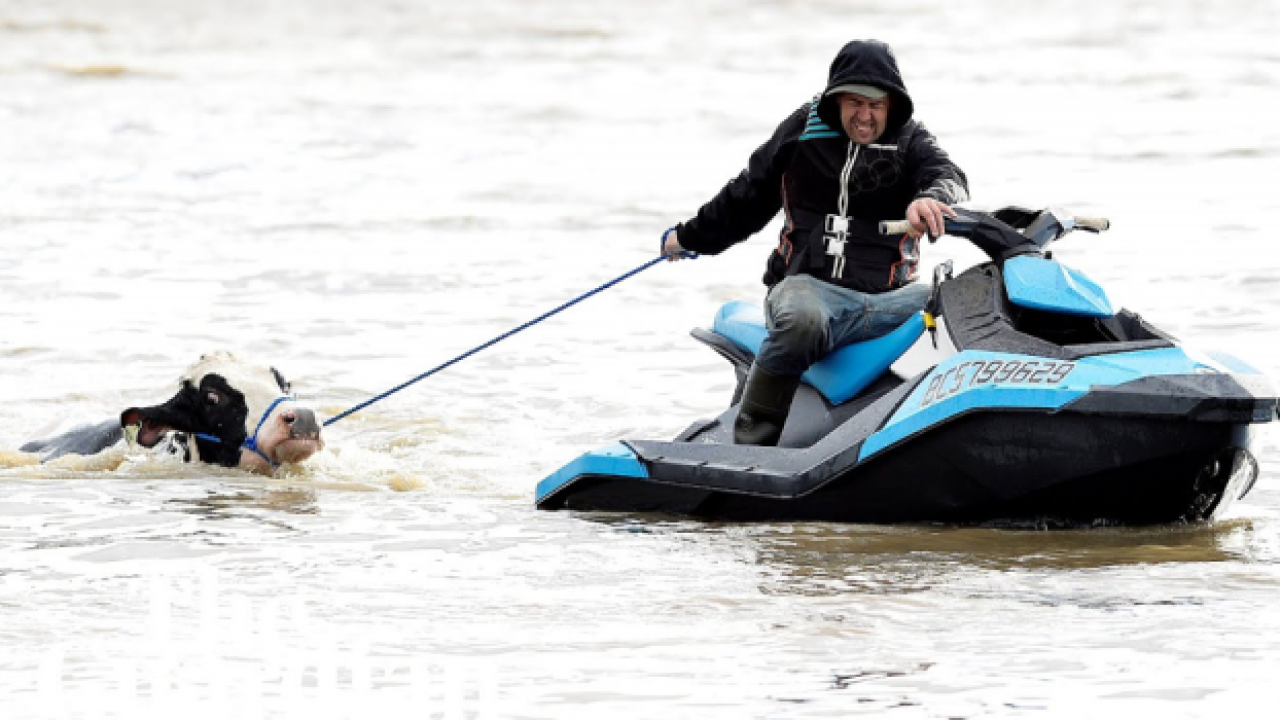 Olağanüstü hal ilan edilen bölgede sel mağduru inekler jet skilerle kurtarıldı.