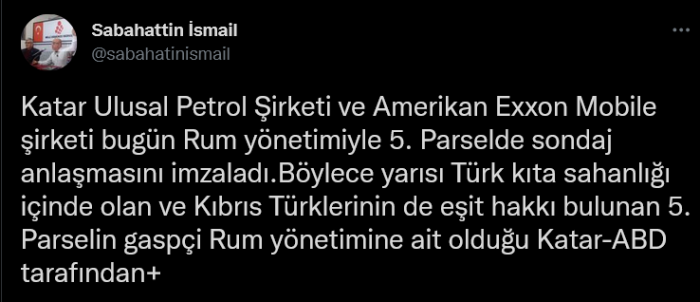 "Katar Ulusal Petrol Şirketi ve Amerikan Exxon Mobile şirketi bugün Rum yönetimiyle 5. Parselde sondaj anlaşmasını imzaladı.Böylece yarısı Türk kıta sahanlığı içinde olan ve Kıbrıs Türklerinin de eşit hakkı bulunan 5. Parselin gaspçi Rum yönetimine ait olduğu Katar-ABD tarafından+