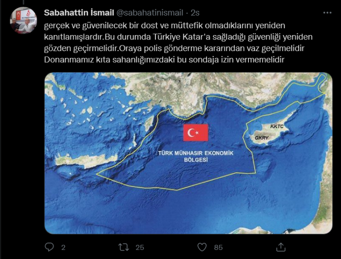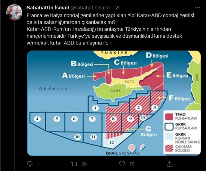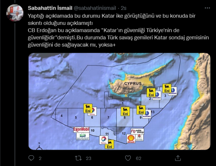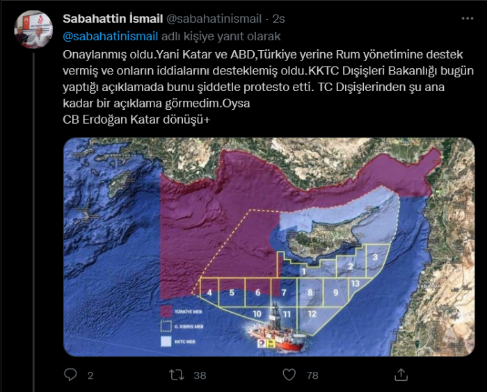 KKTC Cumhurbaşkanı Rauf Denktaş'ın eski danışmanı Sabahattin İsmail, Katar-ABD ortaklığı ile GKRY yöneminin anlaşmasına tepki gösterdi. Sabahattin İsmail, Katar-ABD ortaklığının bu anlaşma ile Türkiye'nin kıta sahanlığının içinde bulunan ve KKTC'nin de eşit hakkı bulunan 5. Parselin "gaspçı Rum yönetimine" ait olduğunun onayladığını söyledi. İsmail, KKTC Dışişleri Bakanlığının söz konusu olayı şiddetle protesto ettiğini fakat Türkiye Cumhuriyet Dışişleri Bakanlığının henüz konuya ilişkin bir açıklama yaptığını görmediğini ifade etti. Söz konusu anlaşmasnın Türkiye'ye düşmanlık ve saygısızlık olduğunu söyleyen İsmail'in paylaşımları şöyle: