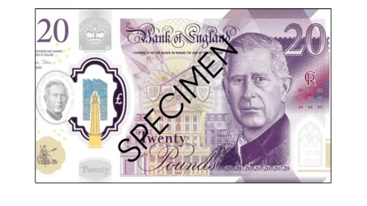 İngiltere Kralı III. Charles'ın portresinin bulunduğu 5, 10, 20 ve 50 pound'luk banknotların basım halinde olduğu ve 2024'ün ortasında dolaşıma gireceği bildirildi.
