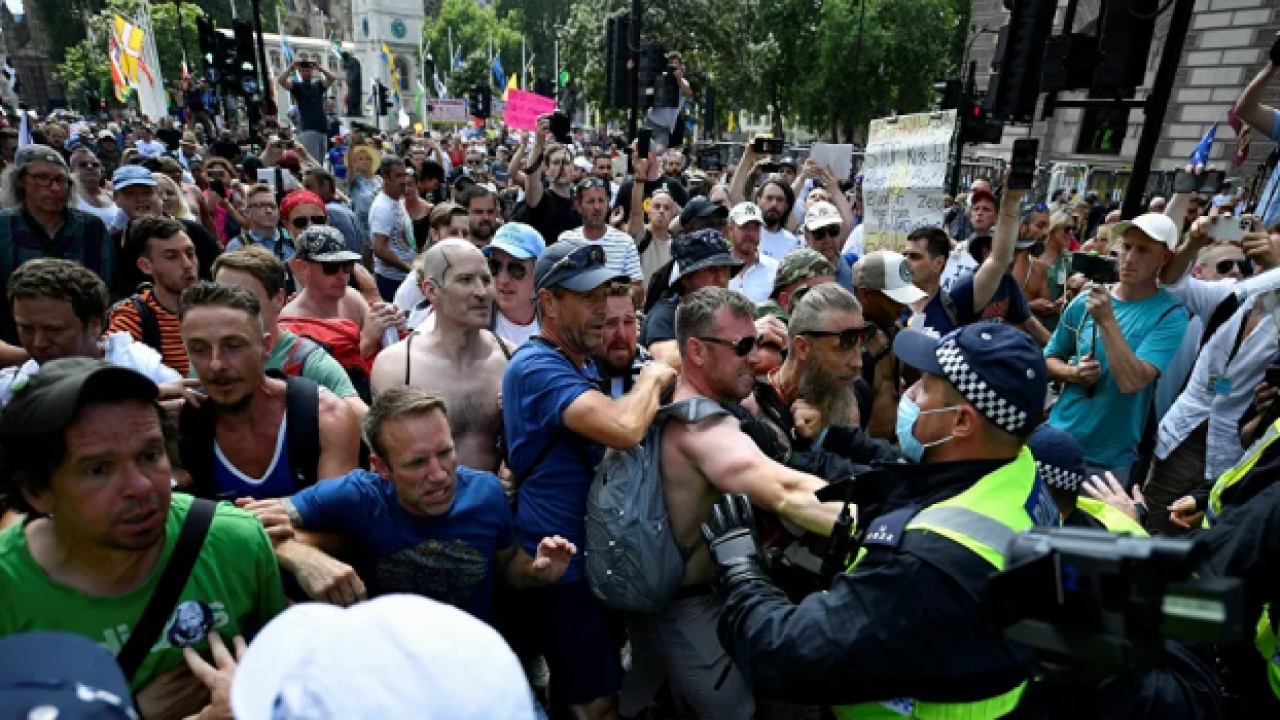 Polis, trafiğin engellenmesi üzerine göstericilerin yoldan çekilmesi için anons yaparken, bazı göstericiler polise şişe fırlattı. Göstericiler ellerinde aşı ve polis karşıtı mesajların yazılı olduğu pankartlar taşırken, pankartlarda 'Özgürlük', 'Polise yazıklar olsun' ve '(Başbakan) Boris Johnson'ı tutuklayın' ifadeleri yer aldı.