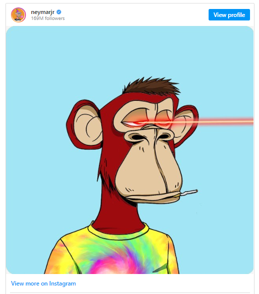 Real Madrid'den Luka Modric kendi NFT koleksiyonunu yaratırken Paris Saint-Germain'den (PSG) Neymar da iki parça için 1 milyon eurodan fazla para harcadı. Brezilyalı yıldız, bu tür tokenlar için en büyük pazar yeri olan OpenSea platformu aracılığıyla Bored Ape Yacht Club (BAYC) koleksiyonundan iki eser satın aldı.