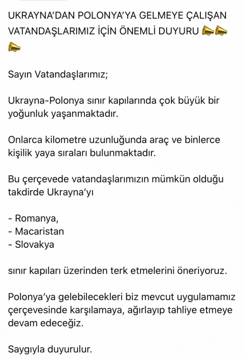 15.05 Türkiye'nin Varşova Büyükelçiliği, Ukrayna'dan Polonya'ya geçmek isteyen vatandaşlara bir uyarı yayımladı. Ukrayna-Polonya sınır kapılarında büyük bir yoğunluk yaşandığı belirtilen açıklamada, Ukrayna'dan ayrılmak için Romanya, Macaristan, Slovakya sınırlarının kullanılması istendi.