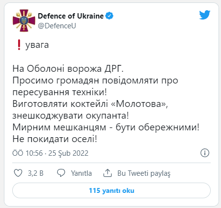 11:55 Ukrayna Savunma Bakanlığı: Rus güçleri Kiev'e girdi. Ukraynalı yetkililer, halka kendilerini savunmak için molotof kokteylleri yapmaları çağrısında bulundu.