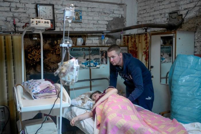 Mıkolayiv'de bir hastanenin bodrum katında doğum yapmayı bekleyen anne