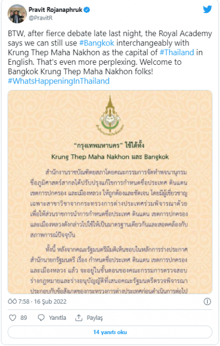 Tayland Kraliyet Ofisi'nin sosyal medya hesabı üzerinden yapılan açıklamada başkent Bangkok'un İngilizce isminin Tayca dilinde okunduğu gibi Krung Thep Maha Nakhon (Bangkok) olarak değiştirildiği bildirildi.