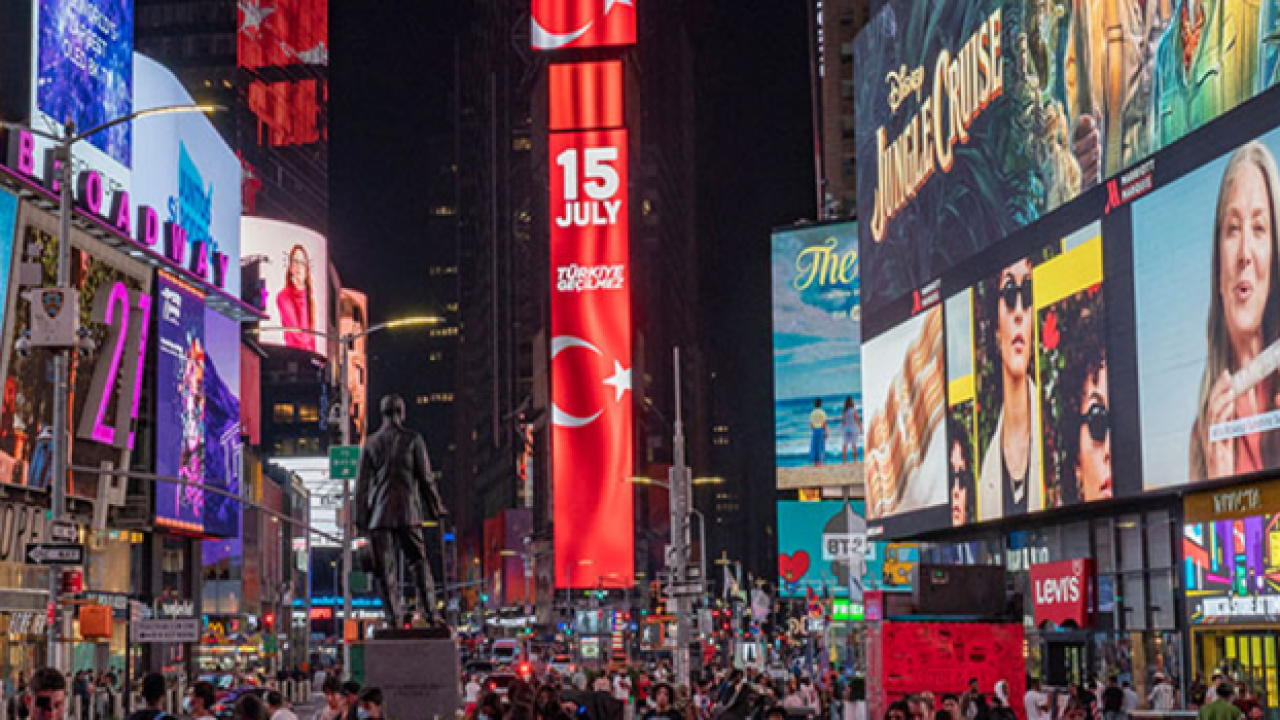 New York’un dünyaca bilinen Times Meydanı’nda bulunan dev dijital ekranda 15 Temmuz, "Victory of Democracy" (Demokrasi Zaferi) ve "Türkiye Geçilmez" mesajıyla anlatıldı. Led ekranda 15 Temmuz'un 251 şehidinin fotoğrafları "Kahramanlarımız" yazısıyla yer aldı. 20 saniye süren görüntüler, Times Meydanında 9 saat boyunca her saatte 30 kez yayınlanıyor.