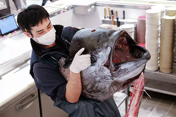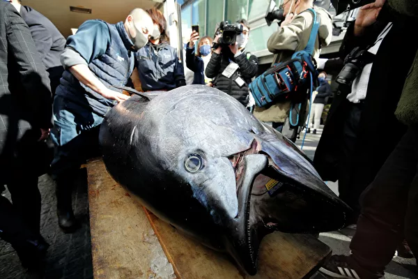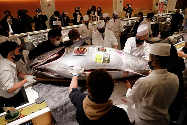 Yerel saatle 05.00'te başlayan mezatta, Aomori eyaletinin Oma bölgesinden bir balıkçının yakaladığı 211 kilogramlık taze ve donmuş mavi yüzgeçli orkinos balığı 16.8 milyon yene satıldı.