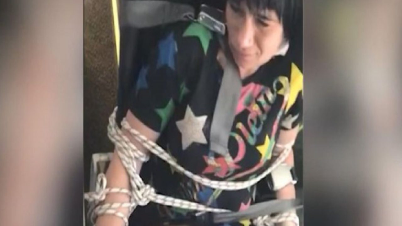 Kabin görevlilerinin uyarılarını dinlemeyen kadın yolcu, kabin görevlileri ve diğer yolcular tarafından iple koltuğuna bağlandı.